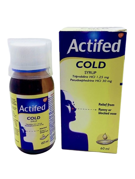Actifed is a fast-acting cold and allergy relief syrup that combines a decongestant (pseudoephedrine) and an antihistamine (triprolidine). It helps relieve nasal congestion, runny nose, sneezing, and sinus pressure, making it ideal for colds, hay fever, and upper respiratory allergies. Suitable for adults and children over 12.